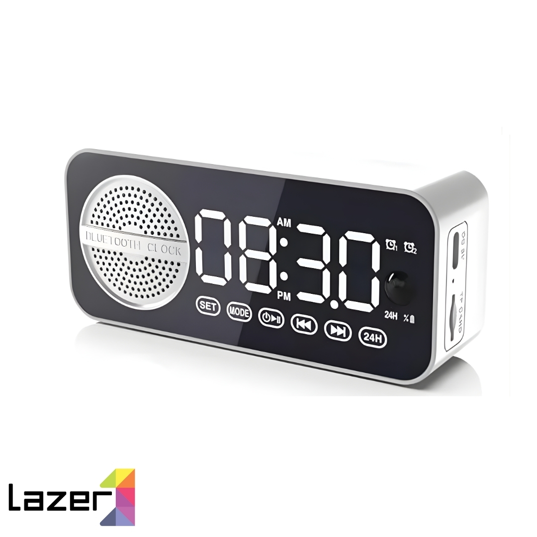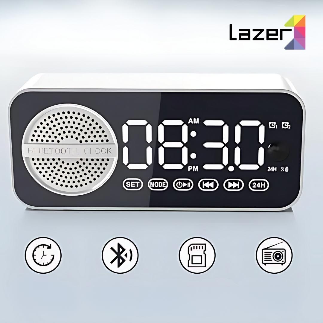 Perfecto para tu escritorio o mesita de noche, este reloj multifuncional combina alarma, altavoz inalámbrico y radio. Su diseño moderno y compacto lo hace ideal para el hogar, la oficina o llevarlo contigo.